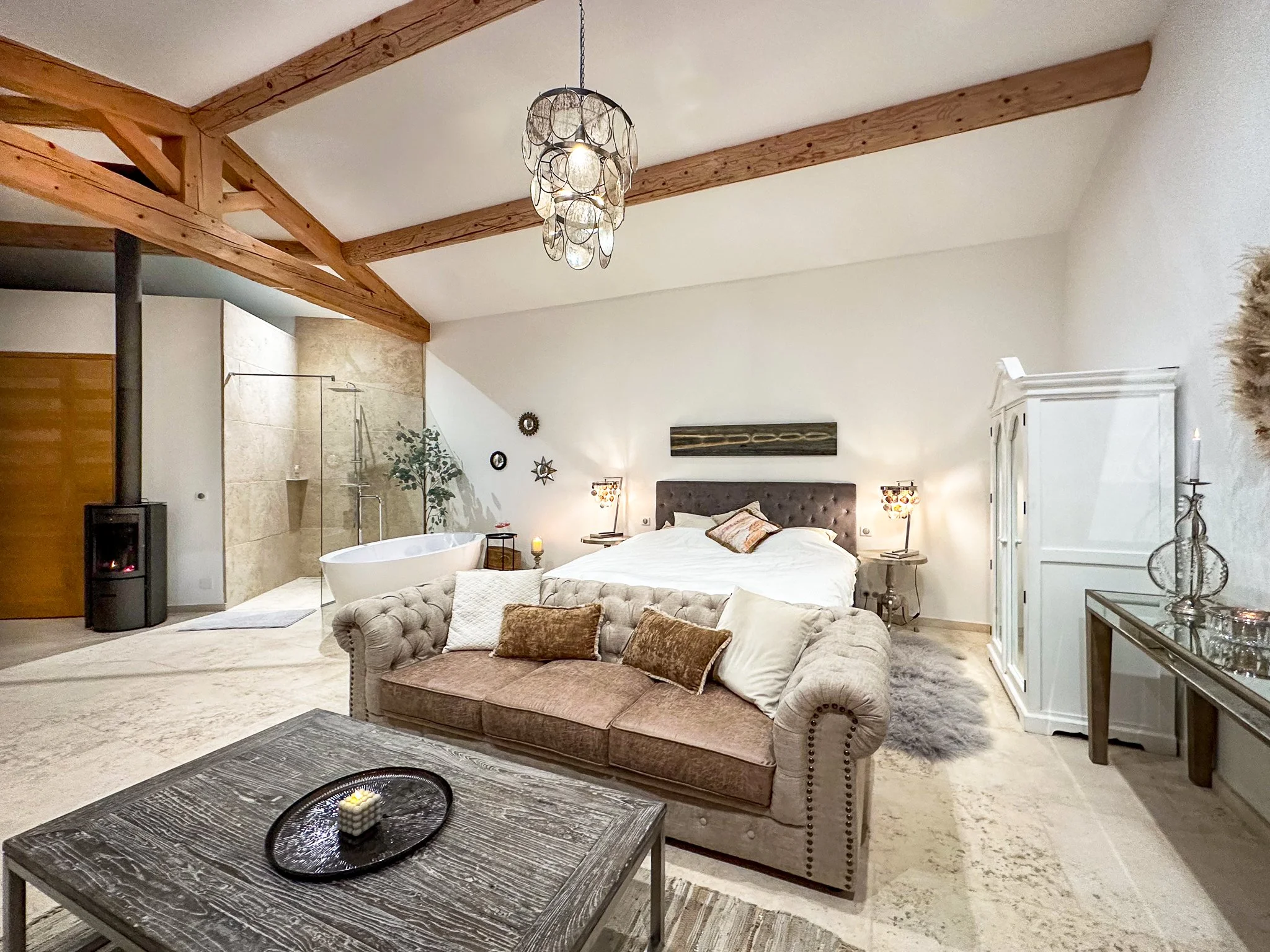 The 52 m2 Master bedroom suite boasts a free standing XL bathtub, high wood beam ceilings, comfortable king size bed, seating area with view and a kitchenette with fridge, freezer, washing machine and your own Nespresso coffee maker to enjoy the first morning coffee without meeting anyone else. There is a separate entrance to a huge terrace with seating just for this suite to enjoy evening drinks or early morning coffee. A fire place next to the bathtub and to be seen from the bed adds to the romantic feeling of this room.